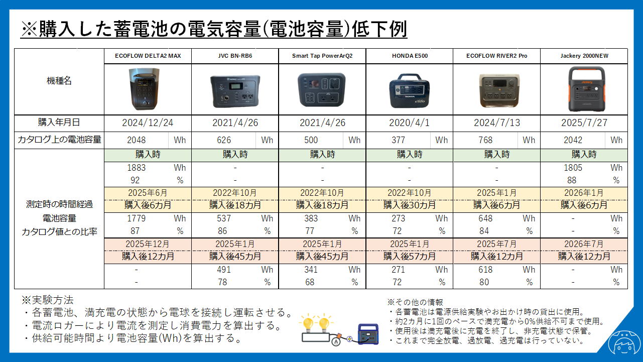 非常時の電源として使用する場合は、必要とする時間ギリギリの電気容量より余裕を持った機種を選択し、3~5年で買い替えるような消耗品として考える必要がありそうです。